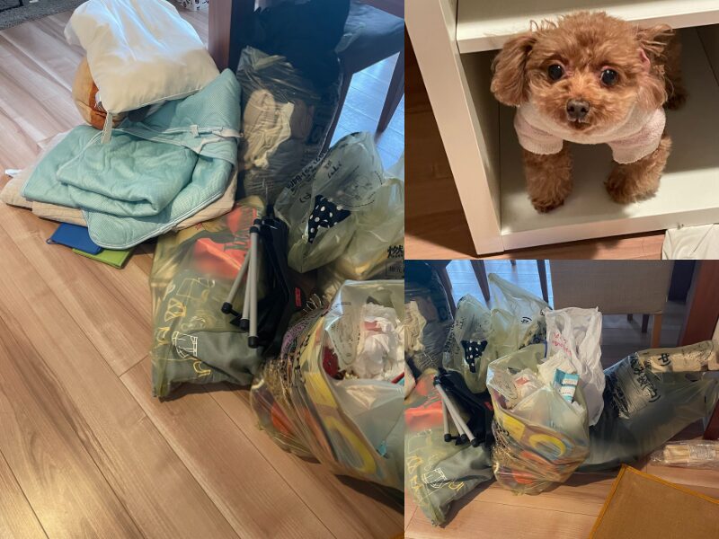 配置が決まりスペース確保のため、断捨離をしました。久しぶりに見直すとサイズが変わったもの・傷んでしまっているものなど不用品がたくさん出てきてびっくり!成人した娘の机は、全く使ってなかったのでこの機会に処分。(写真右上、ココちゃんが入り込んでいるのが机です笑)