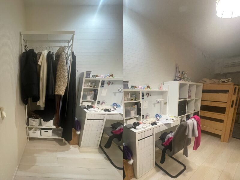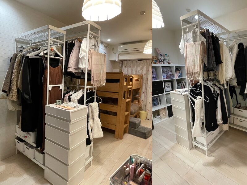 話し合った結果、次女のクローゼットは夫へ明け渡し、長女の部屋に次女の服を持ってきて、女子のクローゼット部屋にしました。成人した長女は机を使うこともなくなり、物置になっていたのでこの機会に撤去。女子の身支度・寝る部屋と明確なゾーニングができました👏